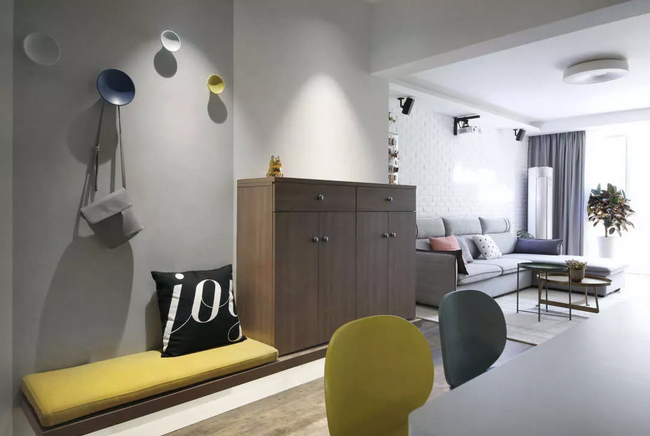 換鞋座與鞋柜都做了掛墻式,沒有落地柜腳的障礙,掃地擦地順暢很多;由于門廳光線弱,柜體離地也有利于客廳的光線更多的傳遞到門廳。當(dāng)然輔助光源一樣不可少。