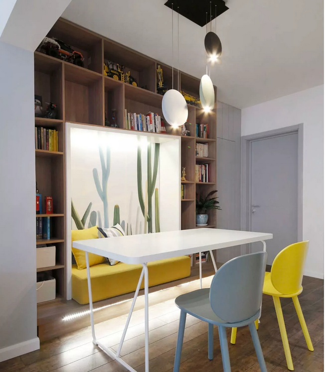 餐廳的位置比較暗,運用隱藏式輔助光源改善光感,軟裝采用綠色與黃色做點綴賦予生機感。墻面的異形置物架又能滿足儲物與展示的需求。