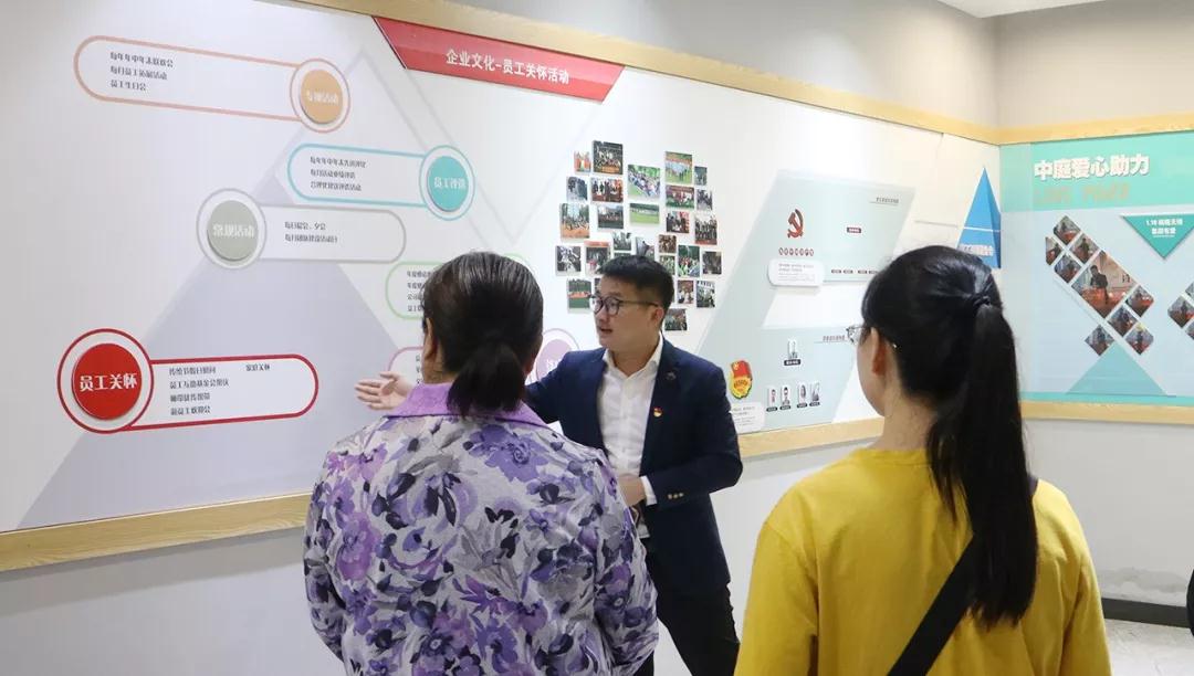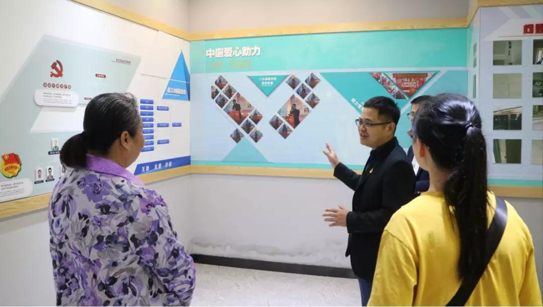 ▲會前集團領(lǐng)導帶領(lǐng)社區(qū)黨委許書記等人參觀集團文化長廊