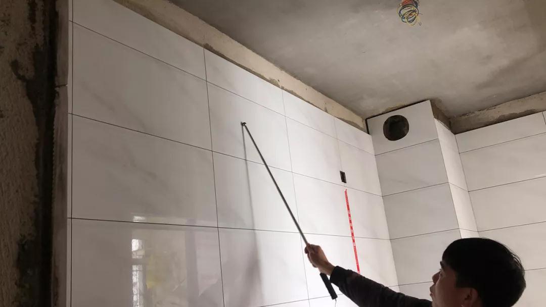 現(xiàn)場(chǎng)檢查是否按圖施工,檢查墻面鋪磚平整度