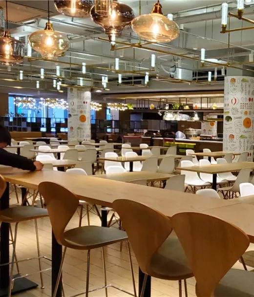 亞廈后勤服務(wù)中心總經(jīng)理向丁胡總裁介紹亞廈的員工食堂以及企業(yè)員工福利待遇的情況