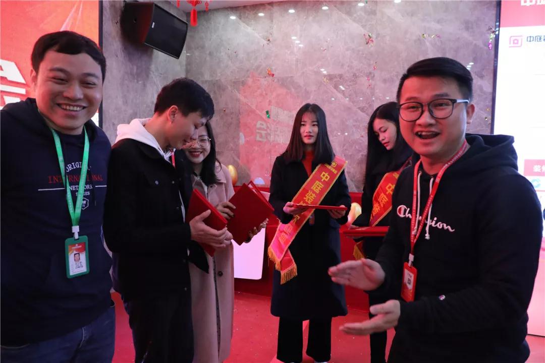 丁胡總裁為獲獎團隊頒發(fā)榮譽證書和獎杯