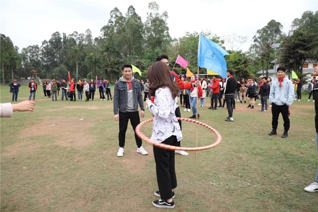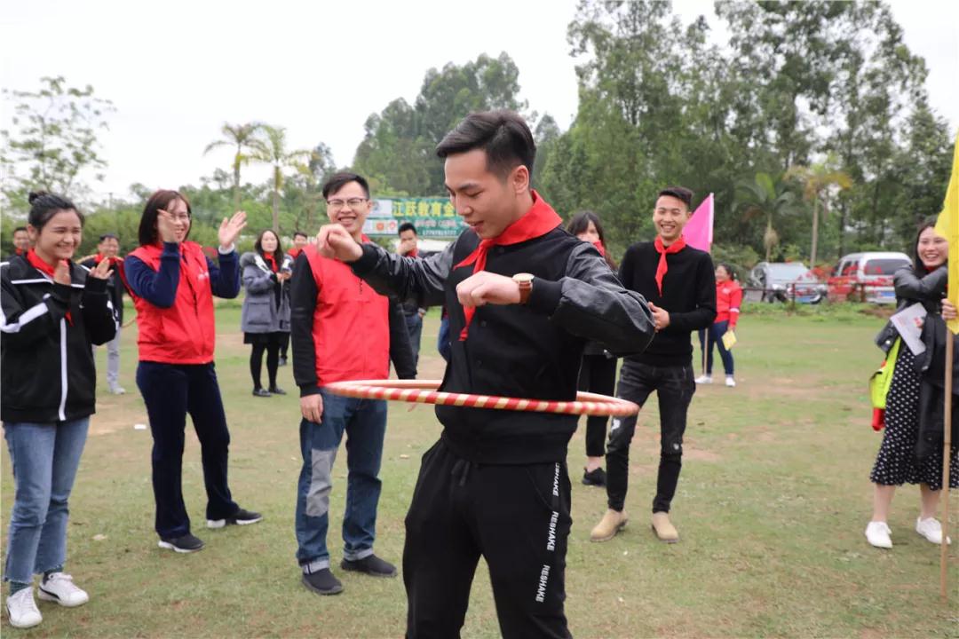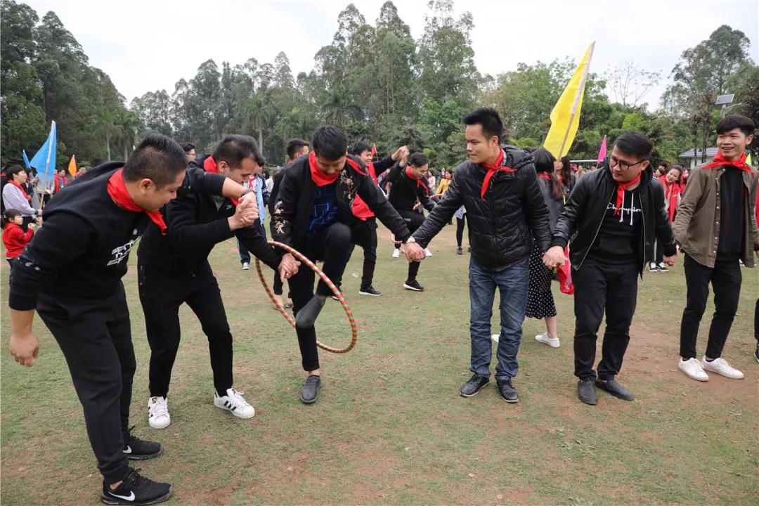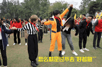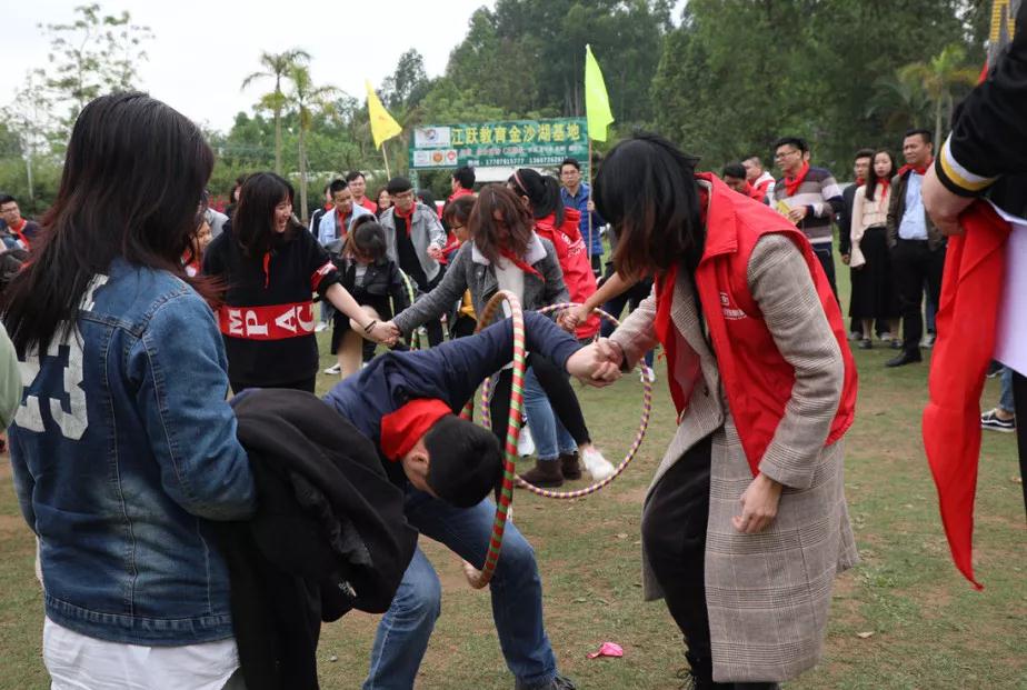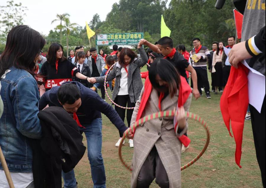 游戲規(guī)則:小組人員手牽手,從第一個人傳遞拉呼啦圈至最后一人,中途隊員不能放開手或者用手去接觸呼啦圈,否側(cè)重來,完成任務團隊。