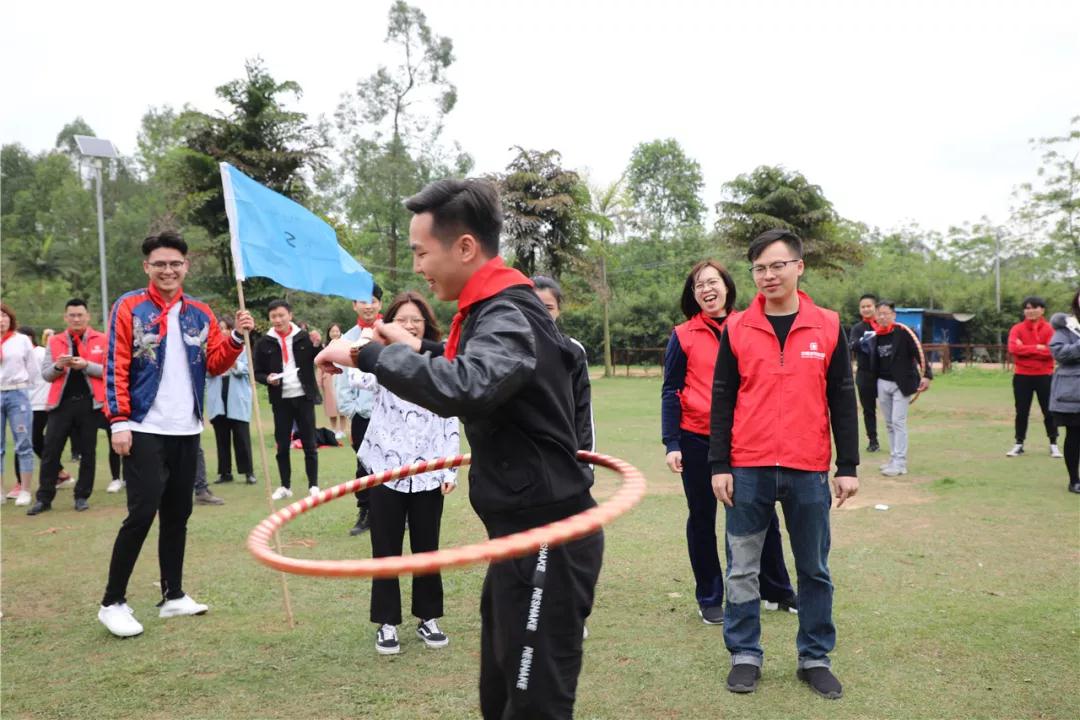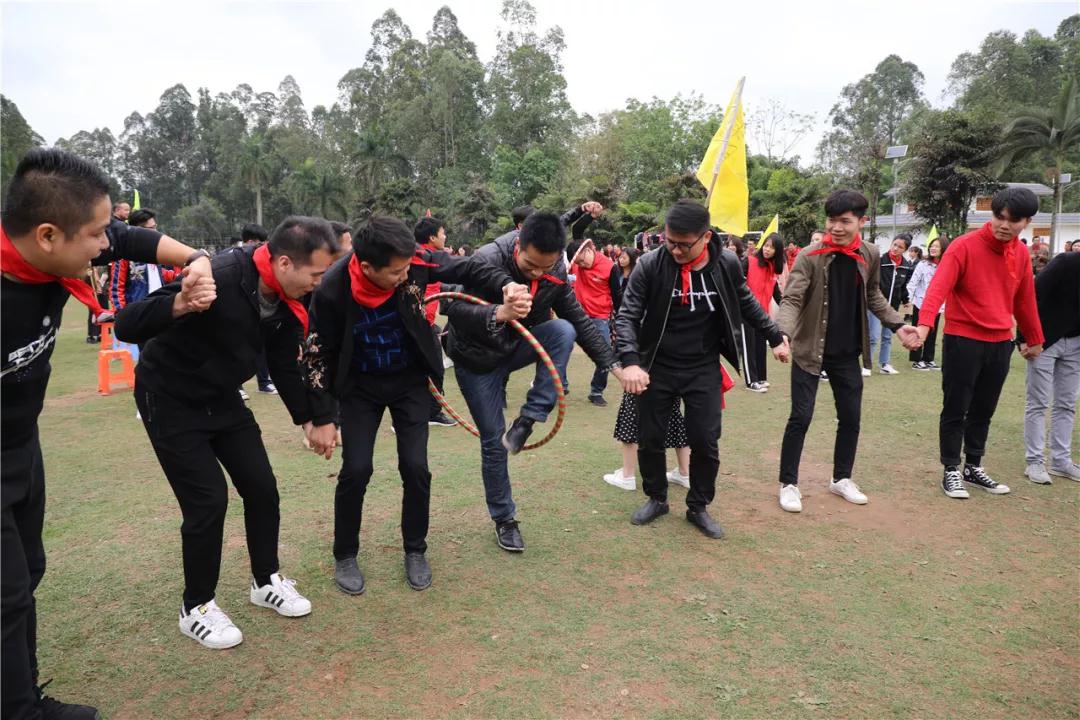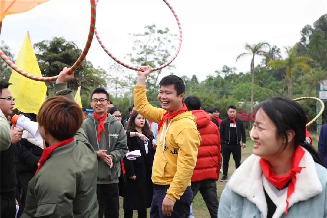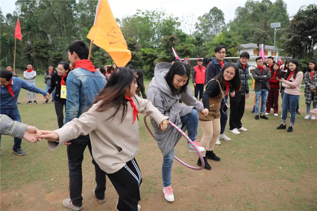 游戲規(guī)則:小組人員手牽手,從第一個人傳遞拉呼啦圈至最后一人,中途隊員不能放開手或者用手去接觸呼啦圈,否側(cè)重來,完成任務團隊。