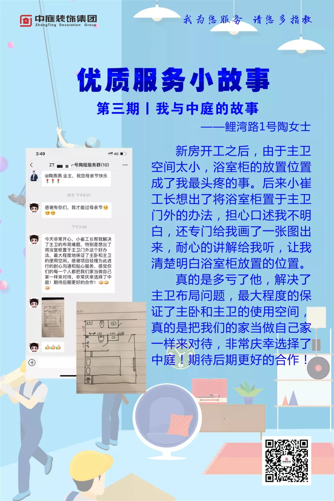 首席設(shè)計師廖吉柯服務(wù)客戶到凌晨,專業(yè)的服務(wù)讓客戶選擇了中庭,與中庭攜手共筑愛家。