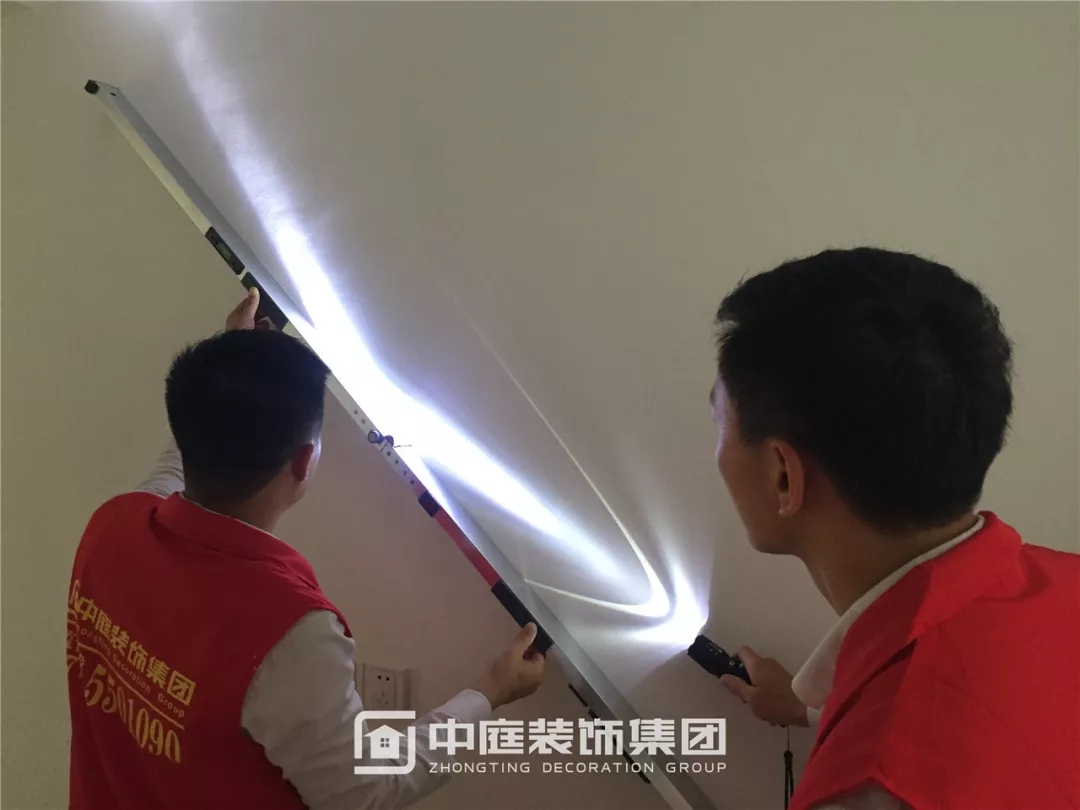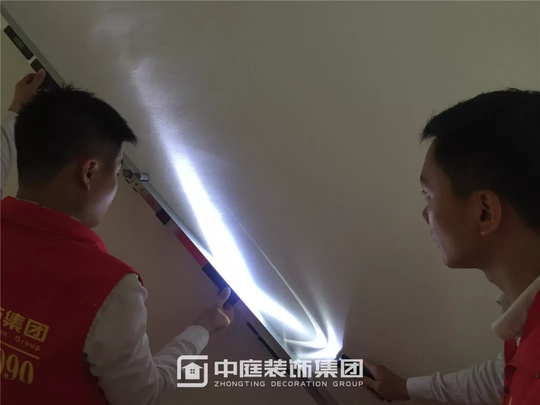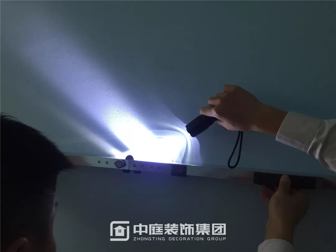強(qiáng)光光線無(wú)法穿透靠尺并產(chǎn)生折射,墻面平整度達(dá)標(biāo)。