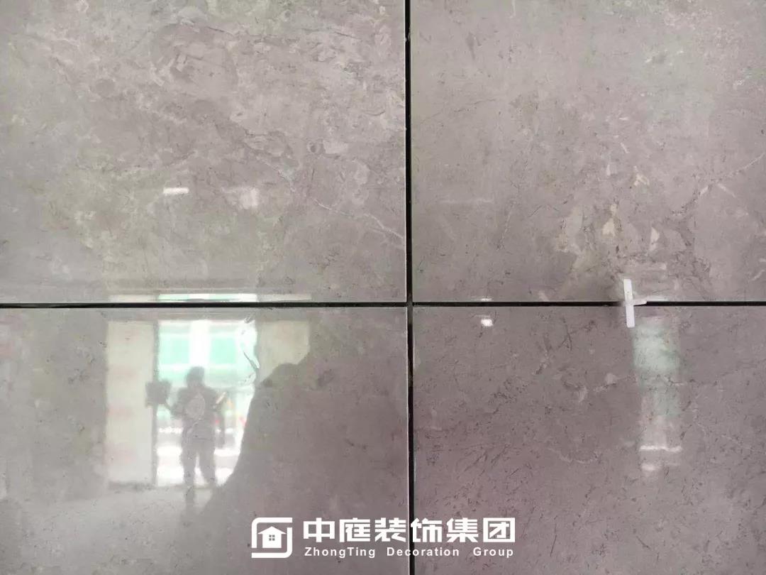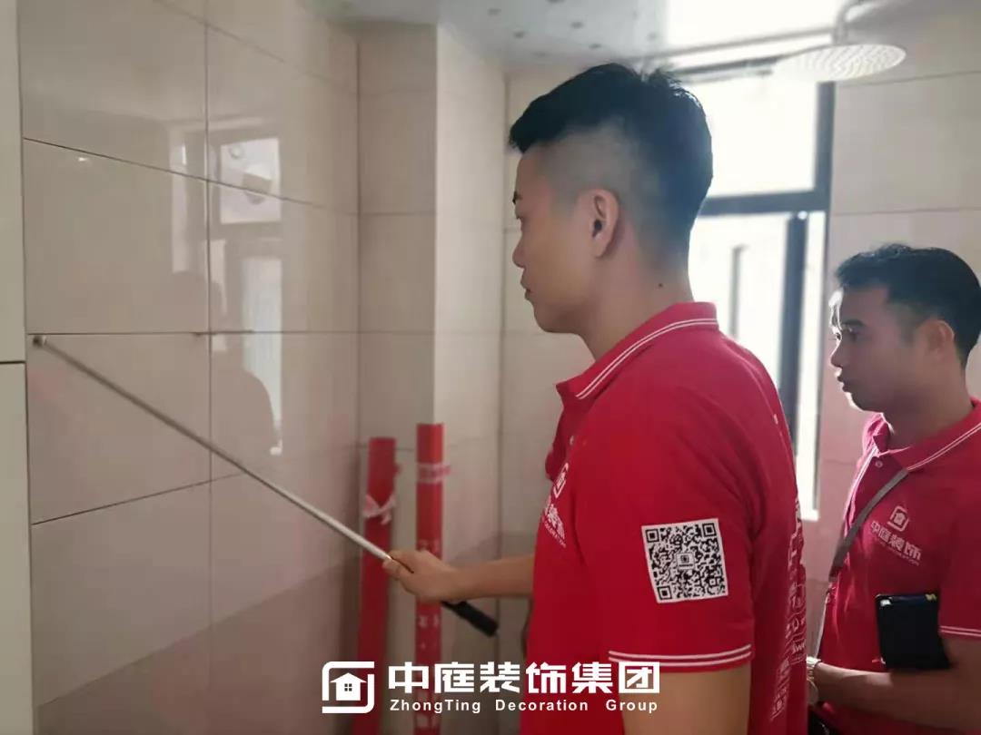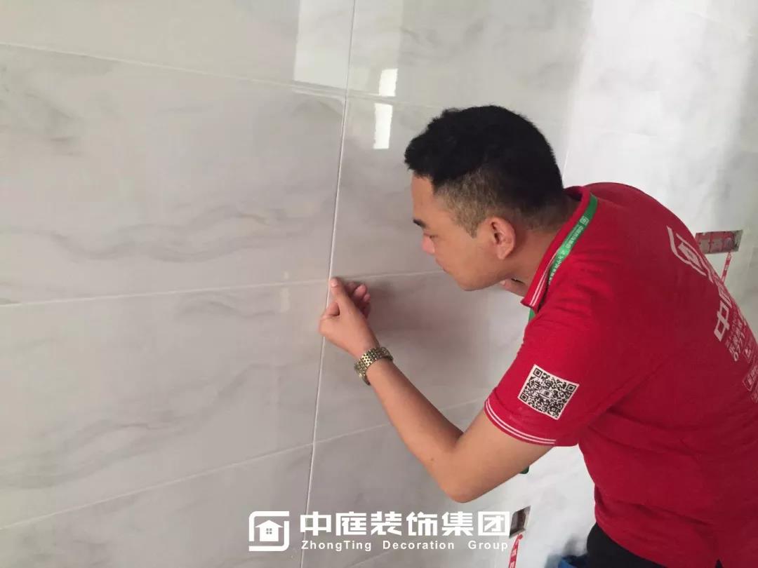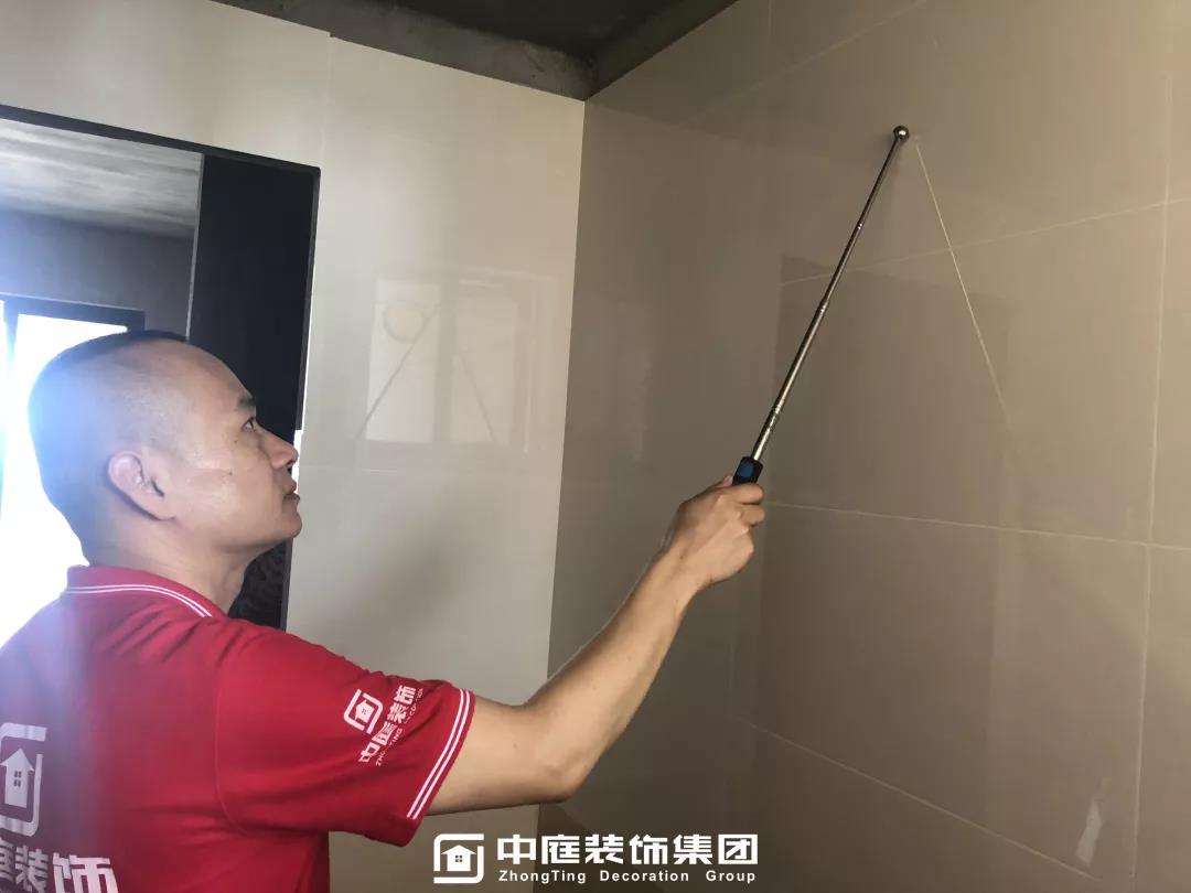 ▲檢查墻磚是否鋪貼平整