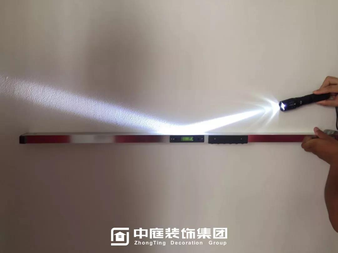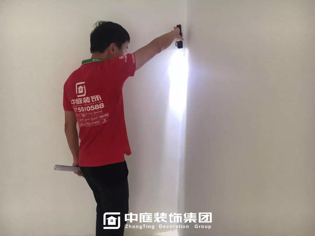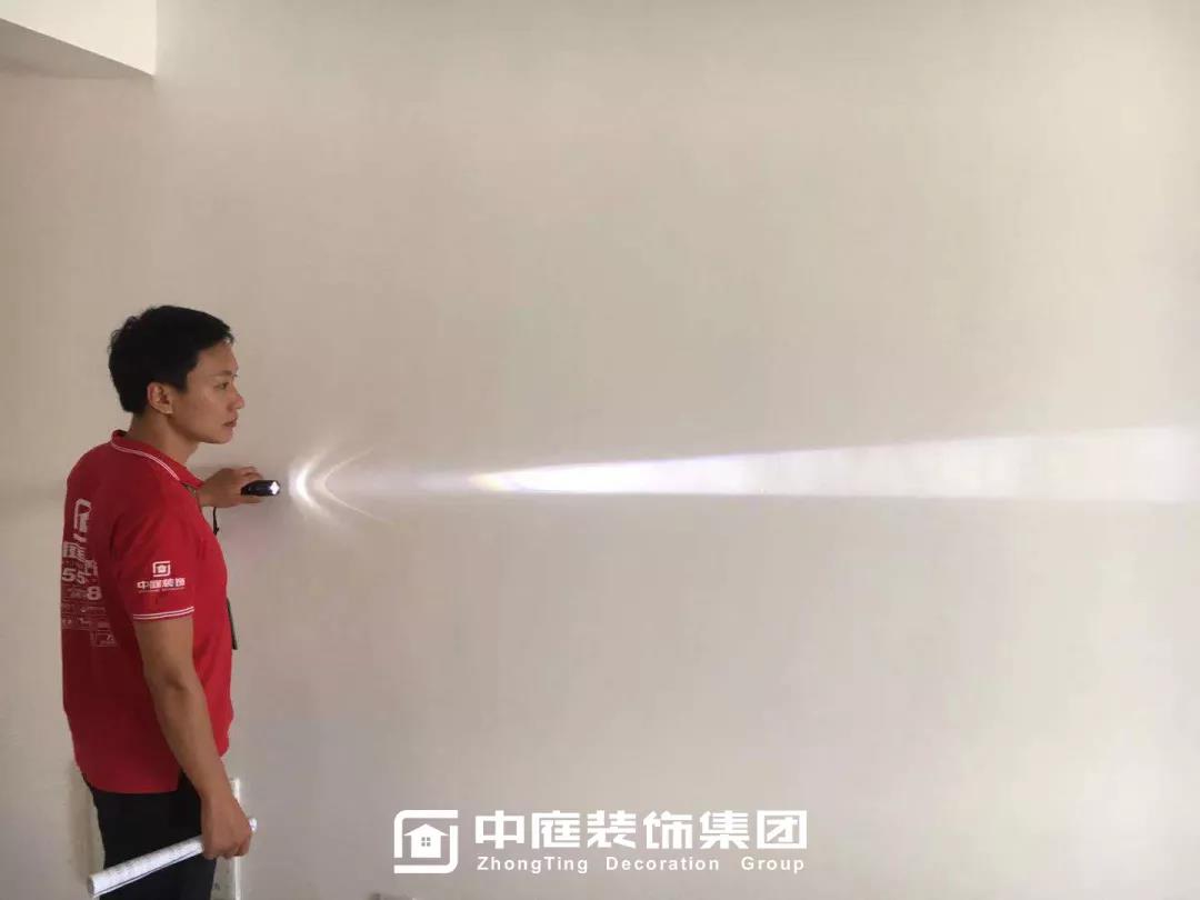 ▲檢查墻體膩?zhàn)邮欠衿秸饣?/span>