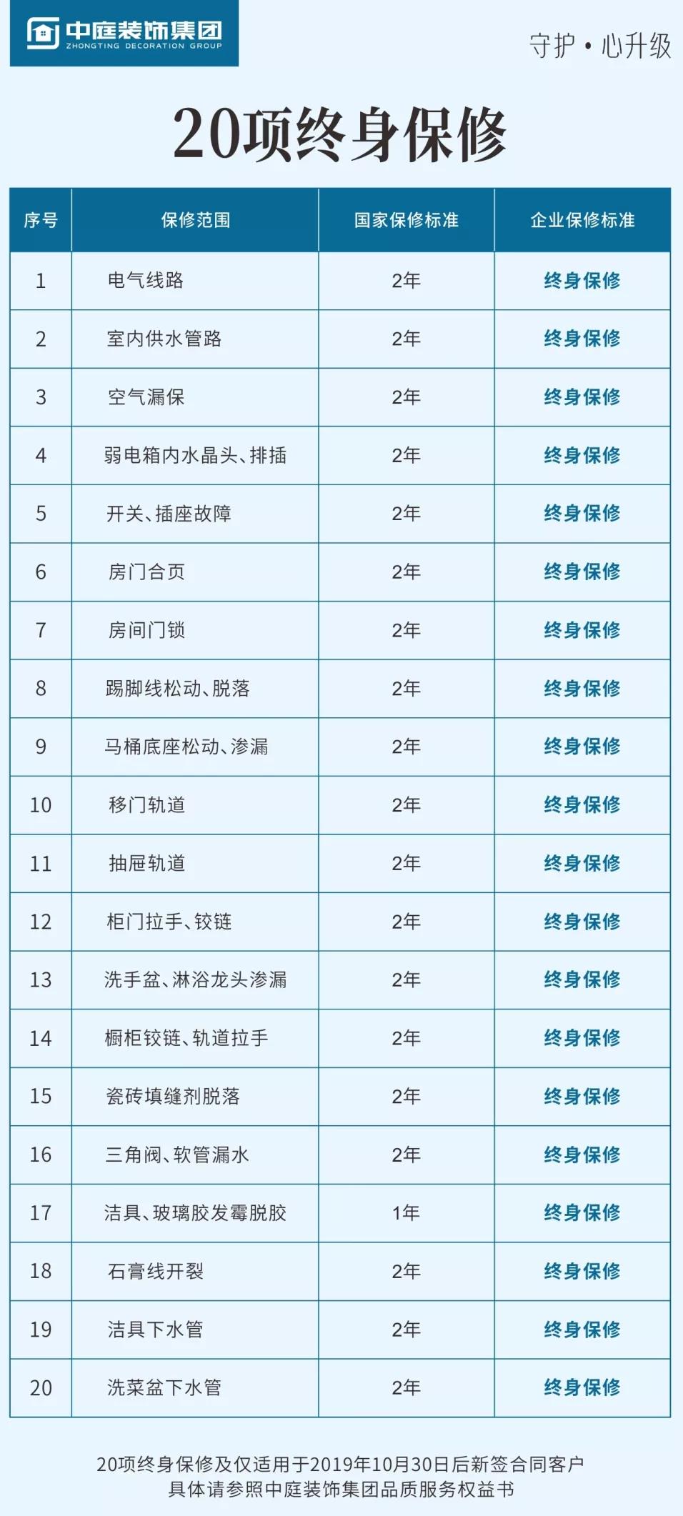 中庭裝飾集團(tuán)20項(xiàng)終身保修上線(xiàn),按照國(guó)家有關(guān)規(guī)定,保修標(biāo)準(zhǔn)為兩年的20項(xiàng)家裝工程,我們承諾終身保修!